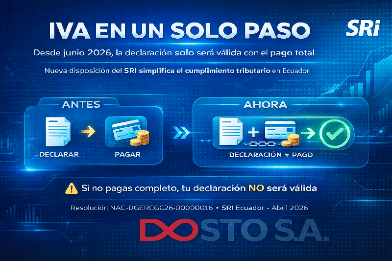 De acuerdo con la Resolución Nro. NAC-DGERCGC26-00000016, a partir del 1 de junio de 2026, los contribuyentes obligados a declarar el IVA deberán presentar su declaración y efectuar el pago correspondiente de manera simultánea.